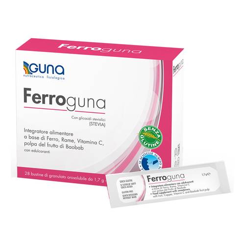 Ferroguna è un integratore alimentare a base di ferro, rame, vitamina C, con polpa disidratata del frutto del baobab. È consigliato come supporto anche nelle situazioni di stanchezza o debolezza, oltre che nei casi di: